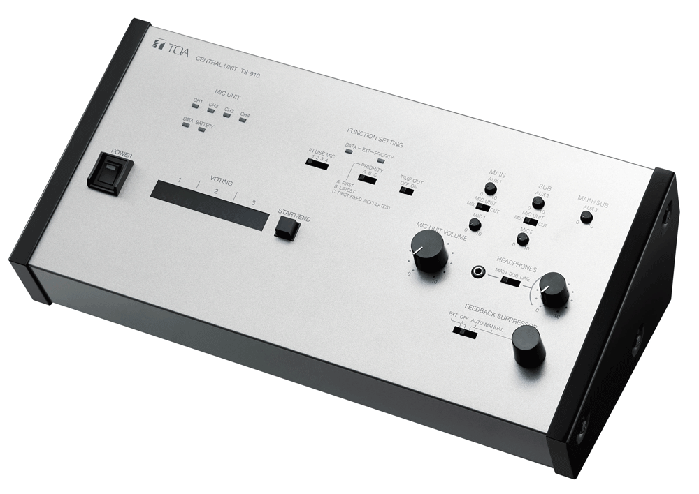 Thiết bị trung tâm TOA TS-910 có thể sử dụng 192 máy chủ tọa và máy đại biểu(vừa không dây và dây dẫn). Chức năng biểu quyết có 3 lựa chọn (đồng ý, không và phiếu trắng). Chức năng tắt tiếng của loa bên trong giúp chống ồn.Chức năng chống phản hồi âm thanh.